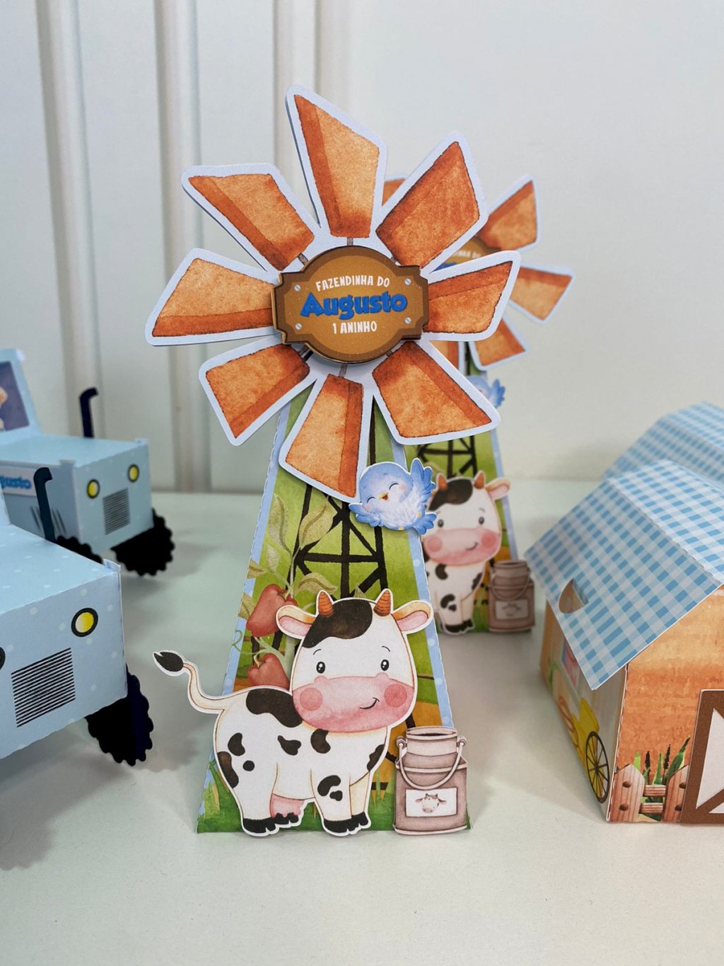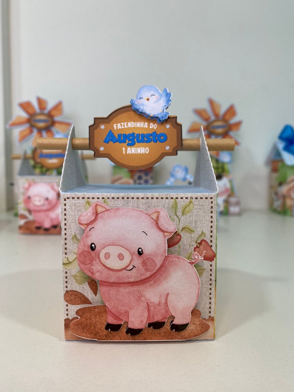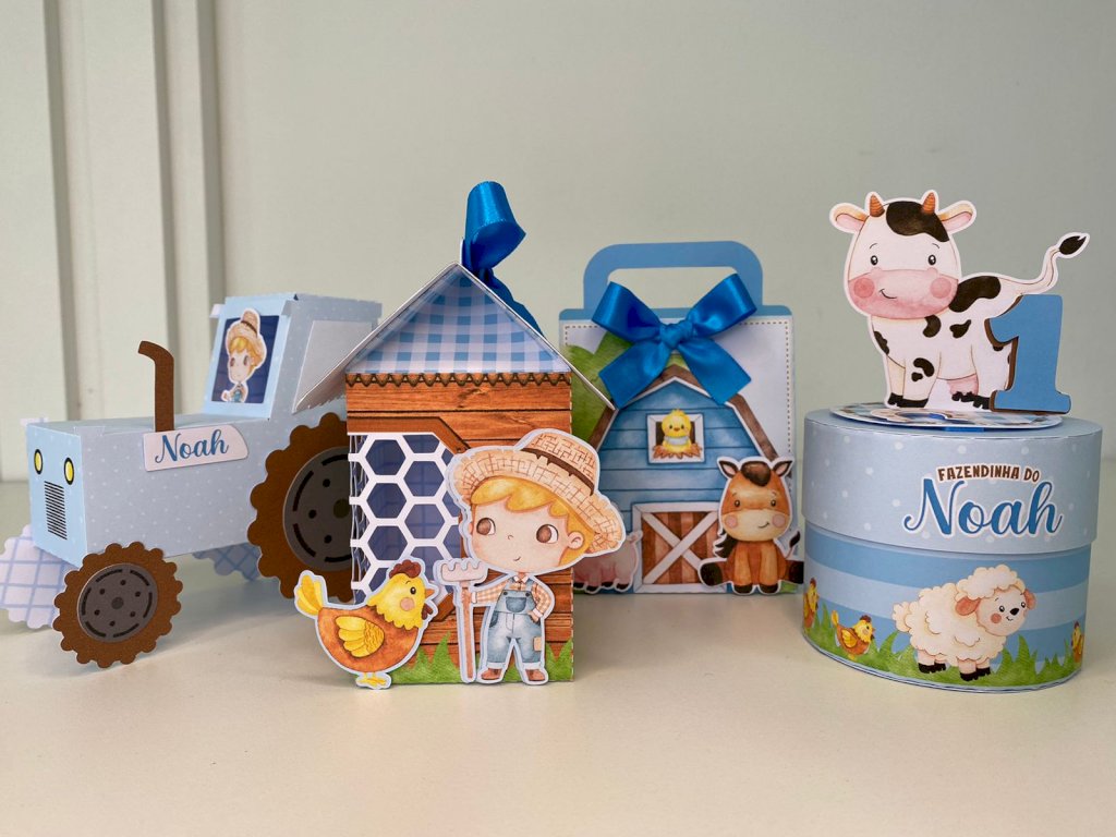 Opção de 60 un: 10 cx galinheiro - 10 cx redonda 3D - 10 trator - 10 sacolinha alça - 10 cone - 10 cx canudo