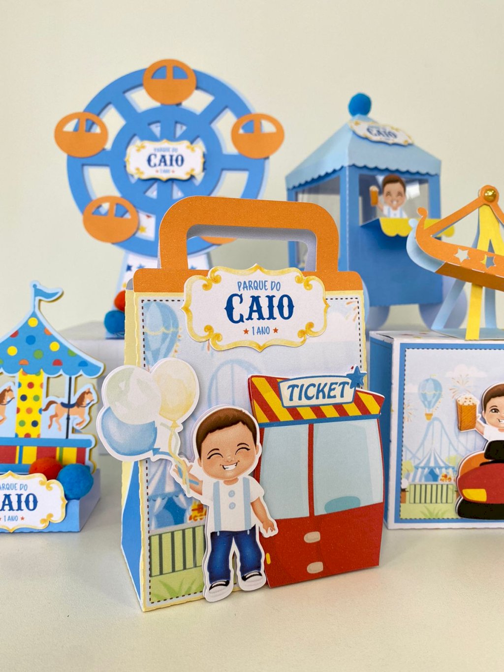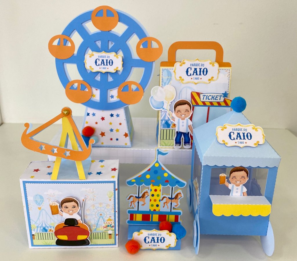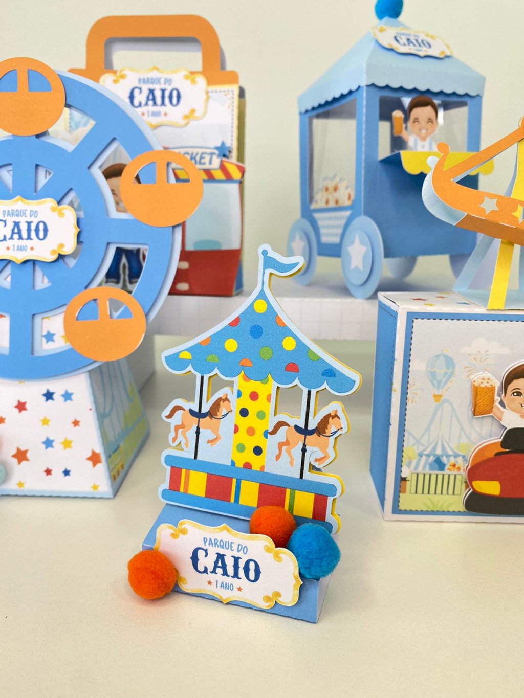Opção de 30 un: 06 cx roda gigante - 06 sacolinha alça - 06 bis duplo - 06 quadrada 3D - 06 carrinho de pipoca